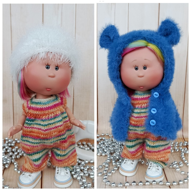 Комплект состоит из пестрого комбинезона, без рукава из носочной пряжи секционного окрашивания-нить сама ложится в узор. И укороченной шубки, с большим капюшоном и ушками на капюшоне из Меха норки. Бонусом добавила описание пушистой шапочки и варежек. Для работы нам потребуются- пряжа-Alize Superwash Artisan, 75% шерсть супервош, 25% полиамид, 100 г\420 м- для комбеза, номер моего цвета-9012, пряжа-Пух норки- 90% пух норки, 10% ПЭ, 350м/50г.-для варежек, из Китайского Пуха норки я вяжу в одну нить и без доп.нити. Мех норки- Полиэстер 100%, 680 м, 100 г Я вязала в 2 нити, без каких-либо добавок. вес шубки-32 гр спицы-1.25, чулочные Подробные, порядные, попетельные описания, сопровождающиеся фото промежуточных этапов работы. Мастер-класс в формате pdf файла. Видео нет.
